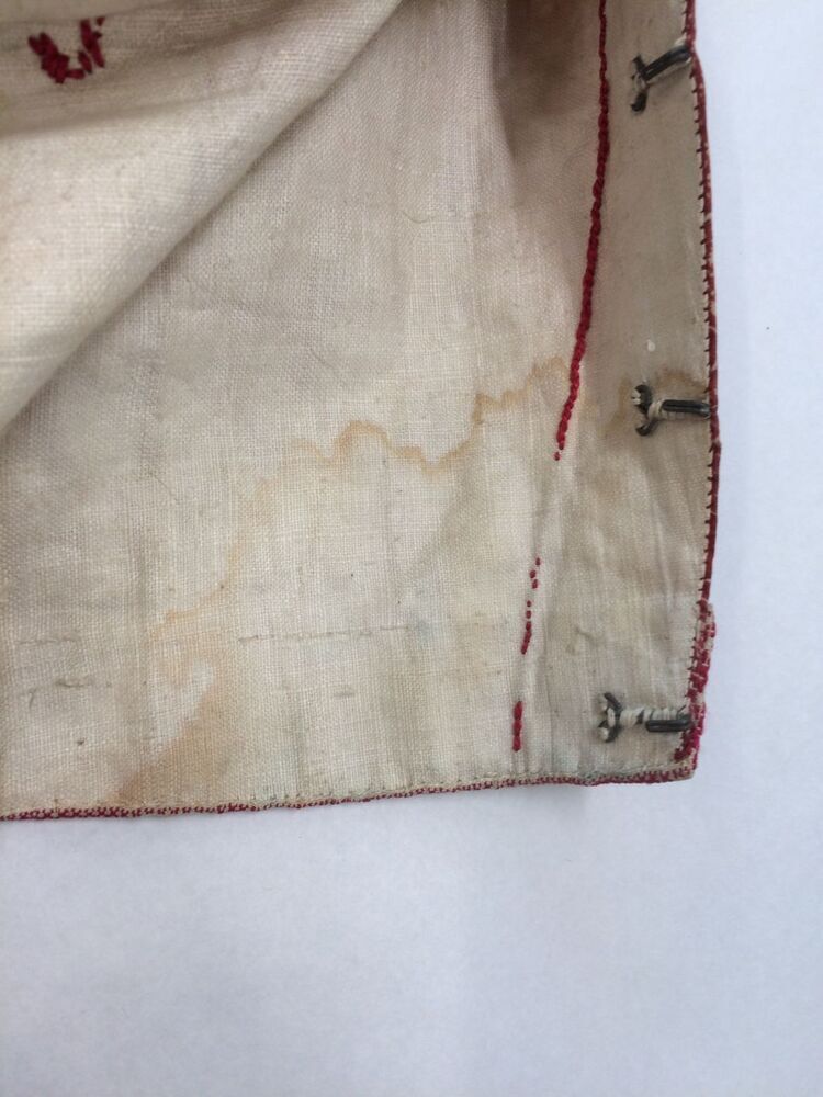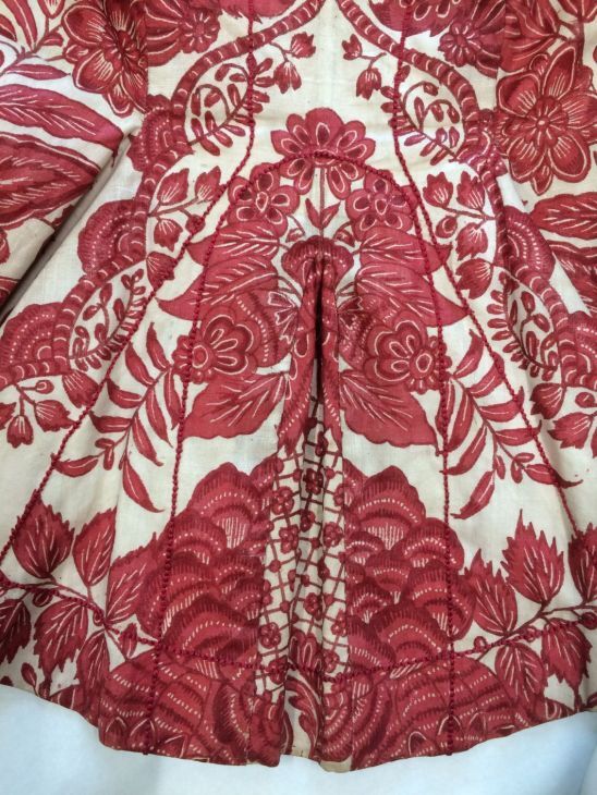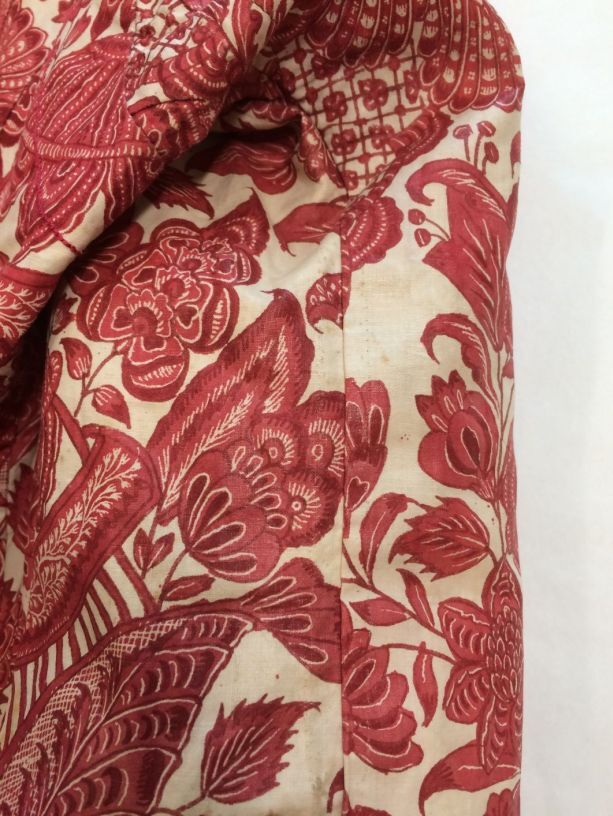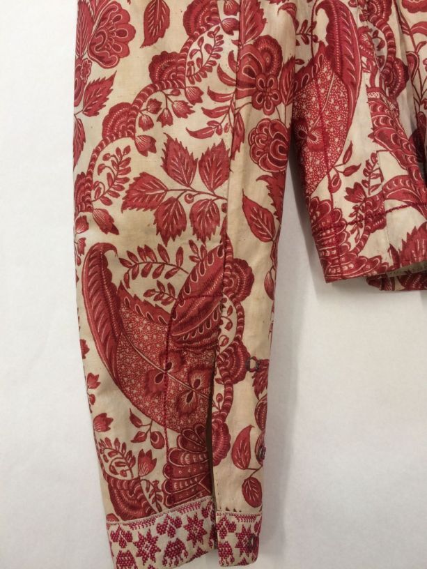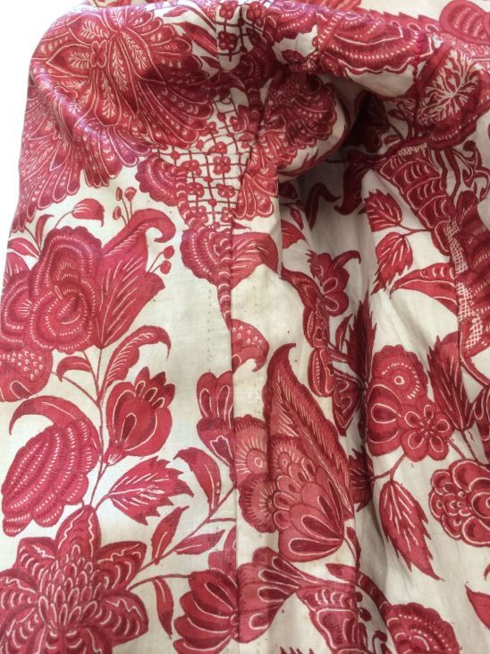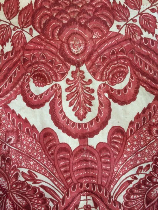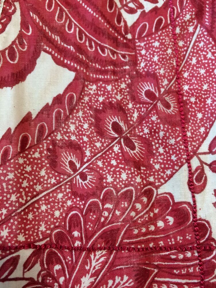 Sitsen Hindelooper kassakijntje afgezet met langetband met kroontjes en sterren,met symmetrische rode palmetmotieven op witte grond