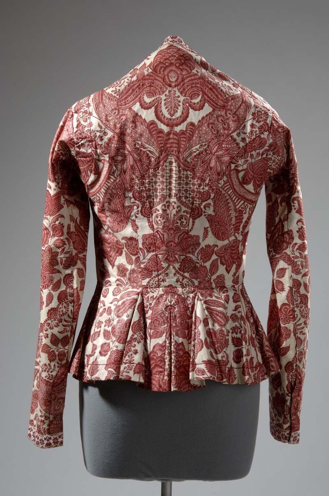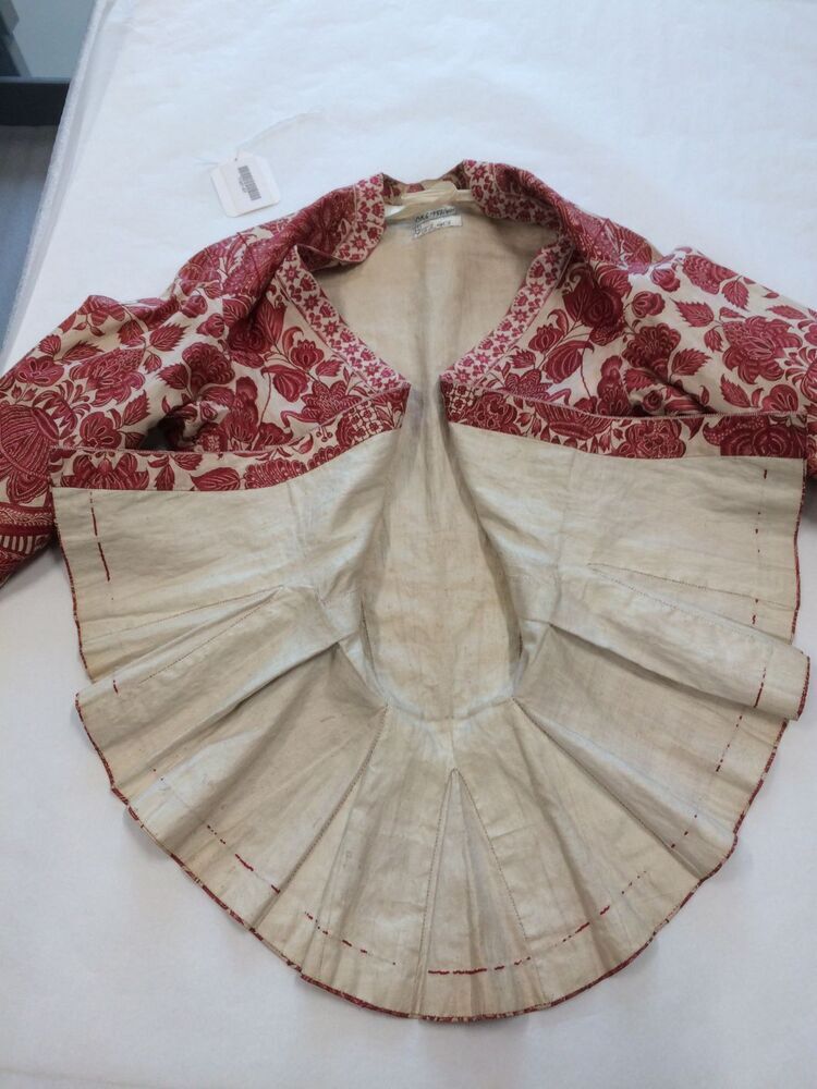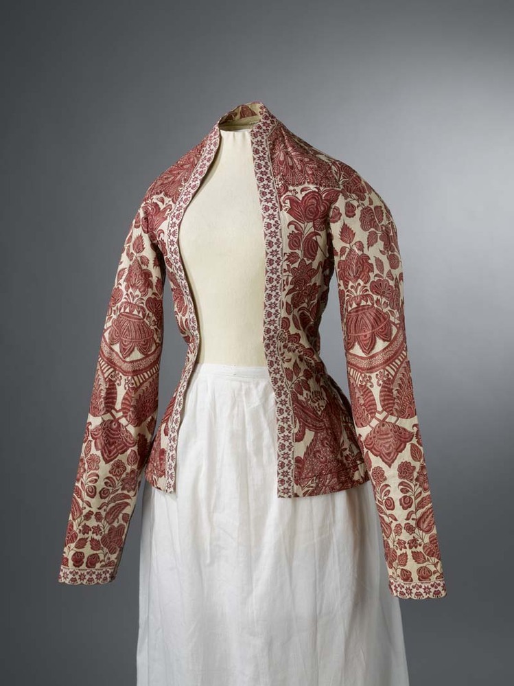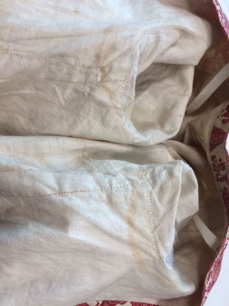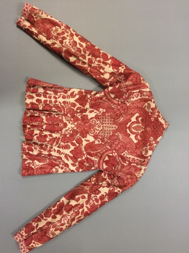 Sitsen Hindelooper kassakijntje afgezet met langetband met kroontjes en sterren,met symmetrische rode palmetmotieven op witte grond