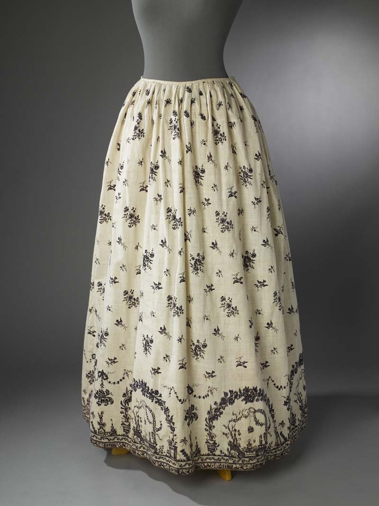 Sitsen vrouwenrok, Europese katoendruk in paarstinten, met strooimotieven en randmotief met chinoiserieën.