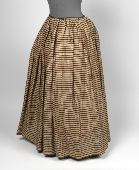 Rok van linnen en zijde met smalle banen, beige, zwart, wit, de onderkant gevoerd met een baan rood, blauw, wit geblokt linnen bont