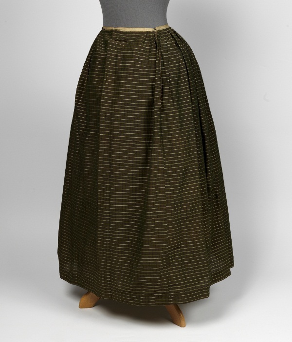 Rok van groene stof, lichtgrijze streepjes, horizontaal, blauwe verticaal