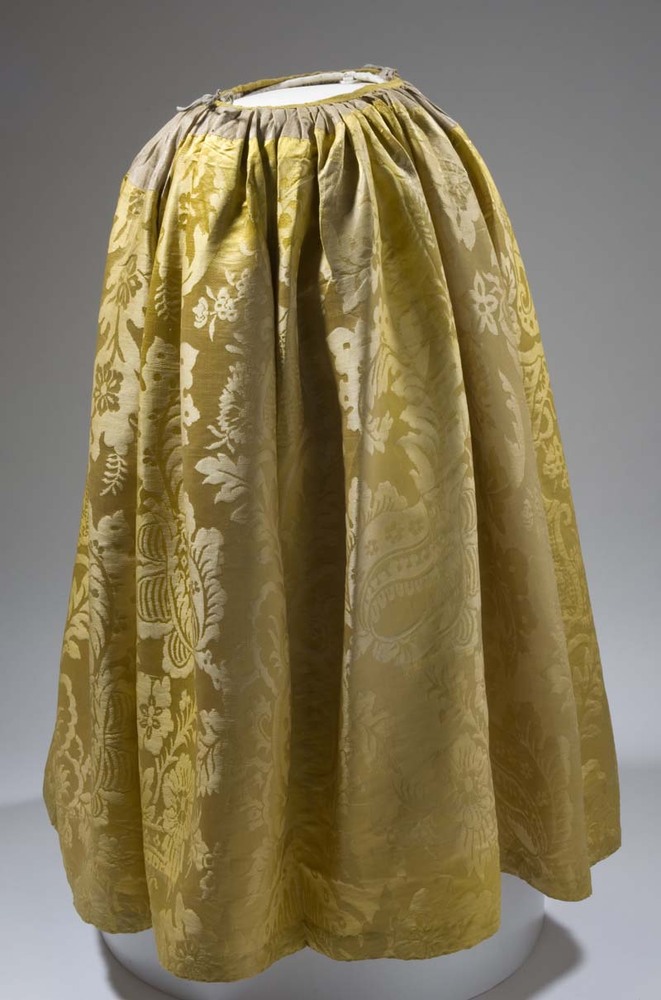 Rok van geel zijden damast met groot symmetrisch bloempatroon.