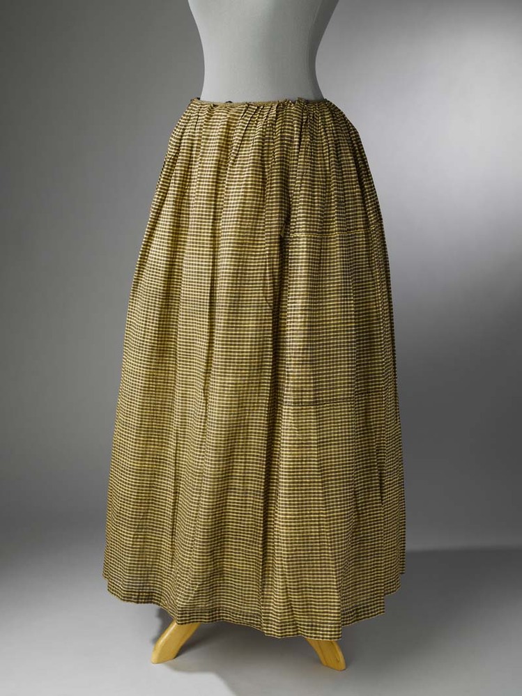 Rok van katoen, kleine bruine hokjes met horizontaal lopende smalle baantjes gele en beige zijde, twee splitten, smalle voorbaan