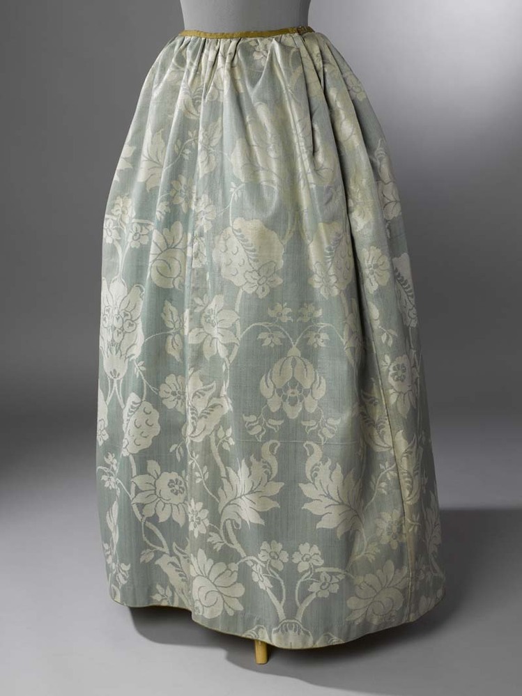 Rok van wol, lichtgroen met grote witte bloem en zoom en splitten afgezet met koord