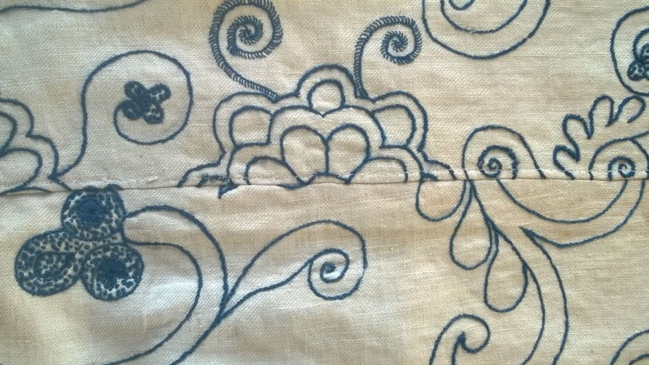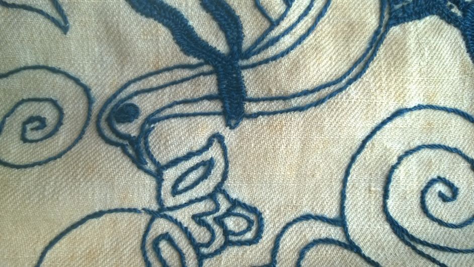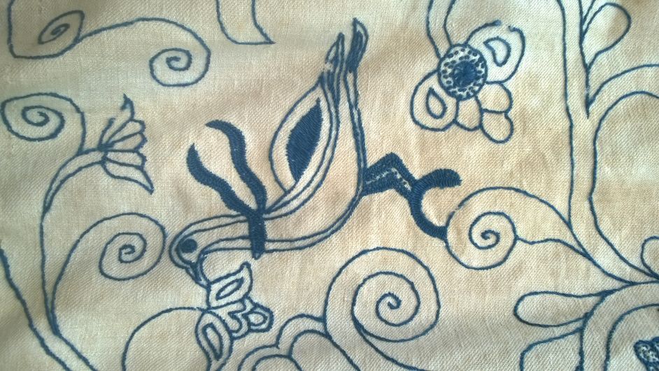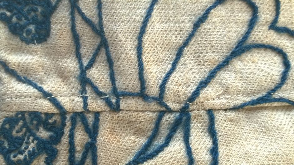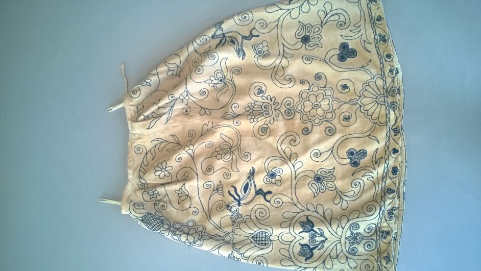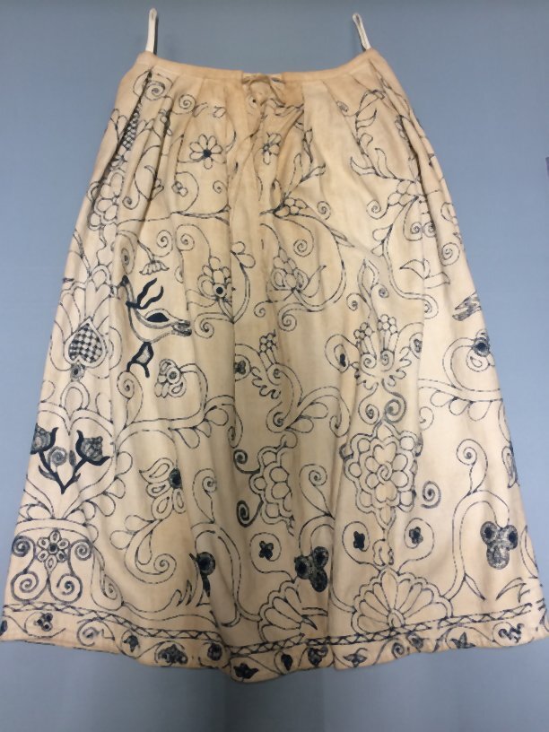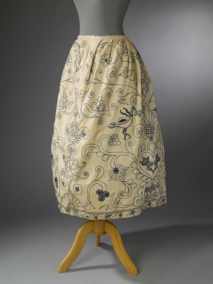 Onderrok van wit fustein in keperbinding, geborduurd met indigoblauwe wol, met vanuit symmetrische motieven met harten en vogels langs de zoom, naar boven uitwaaierende bloemranken.