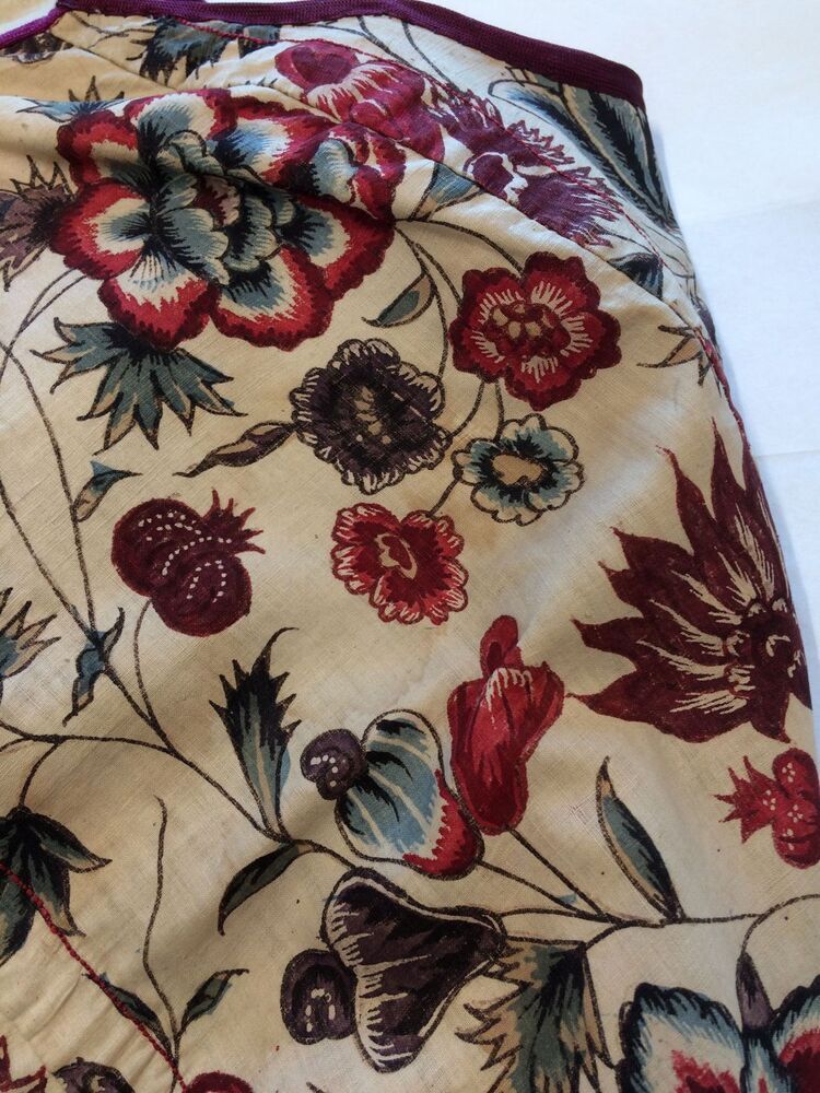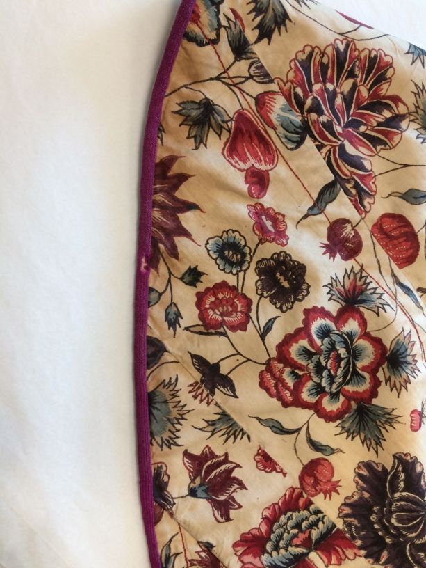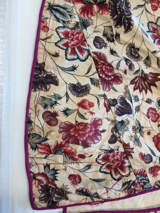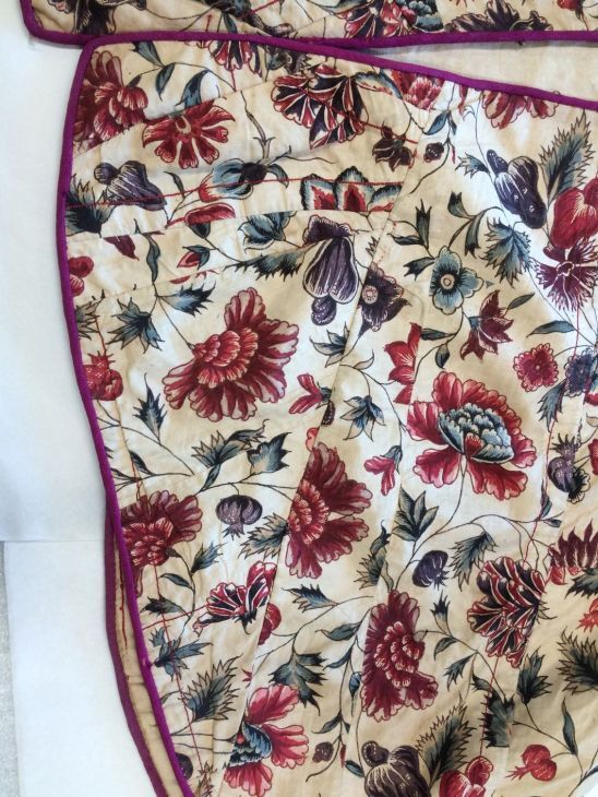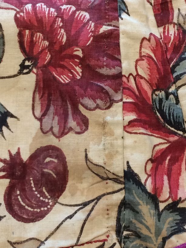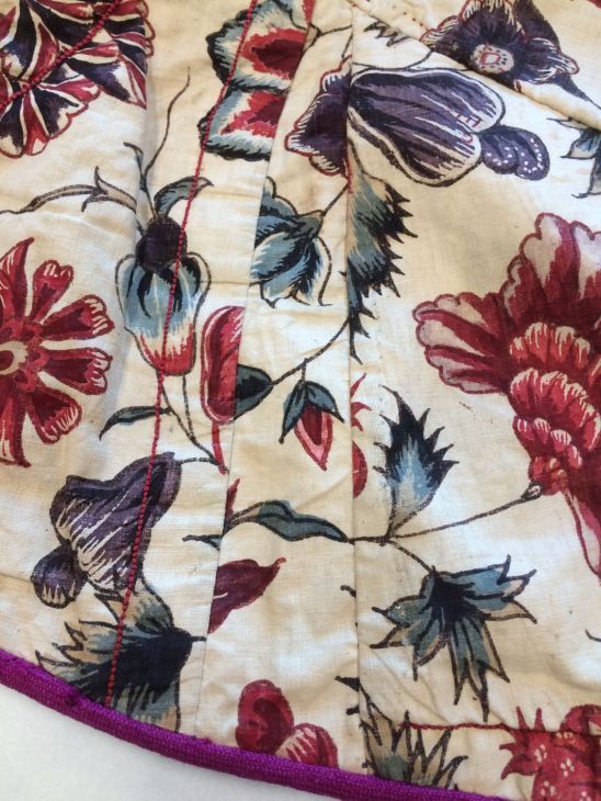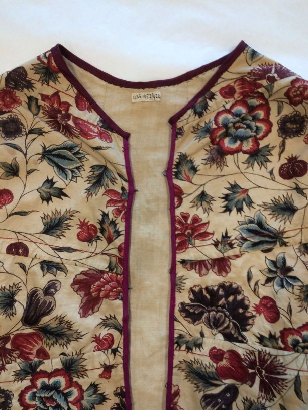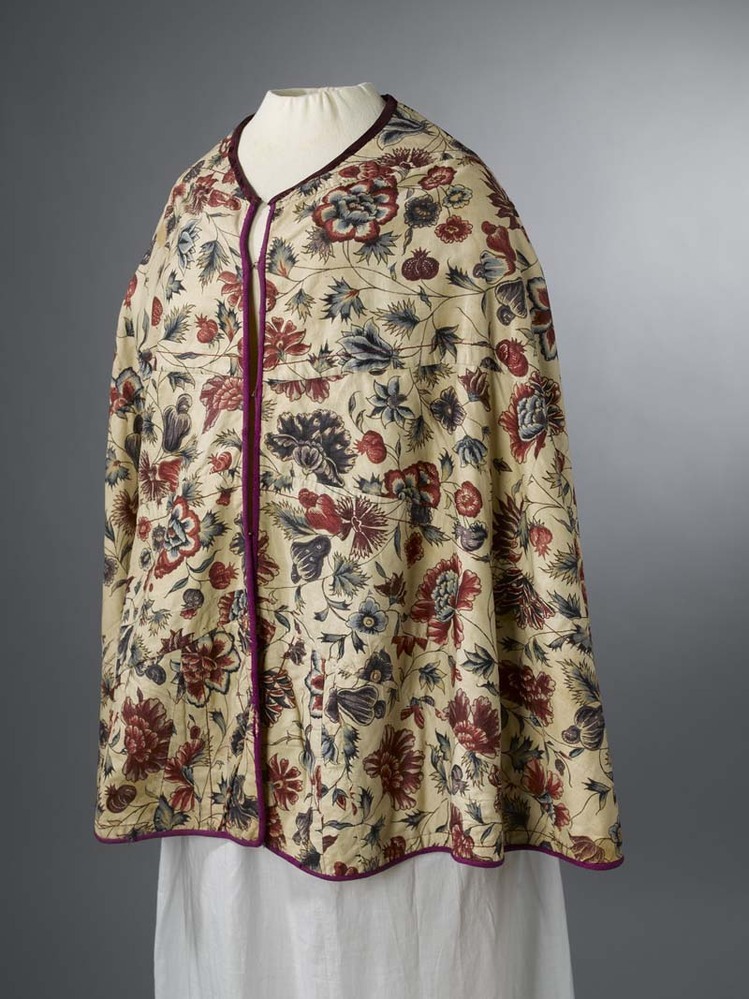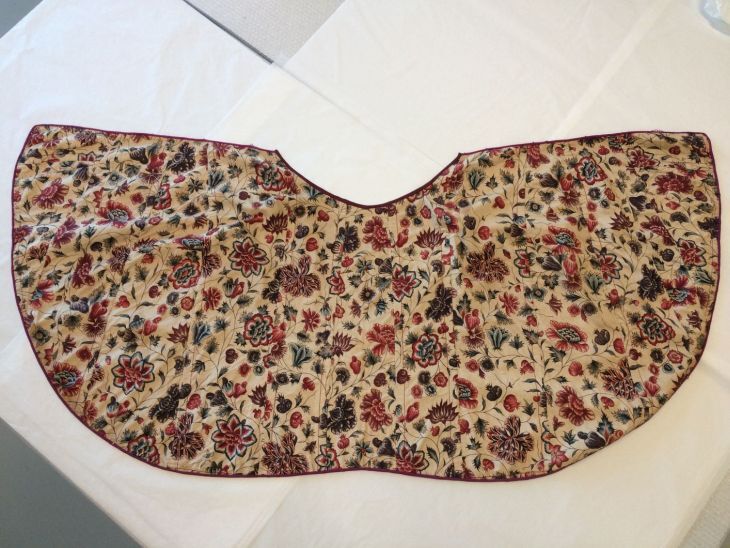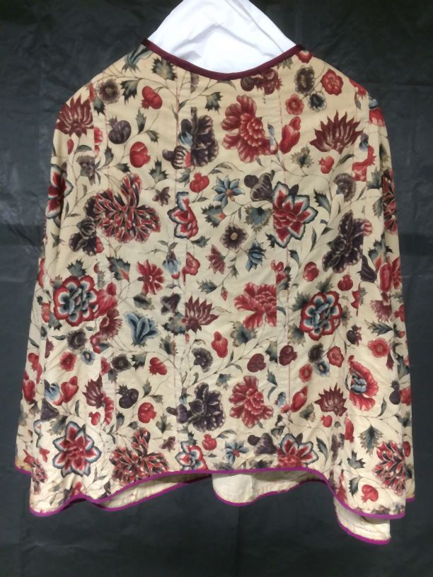 Sitsen Hindeloper skooldermantel gemaakt van wentke met motieven op witte grond waarvan contour, zwart en rood