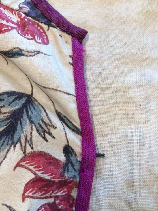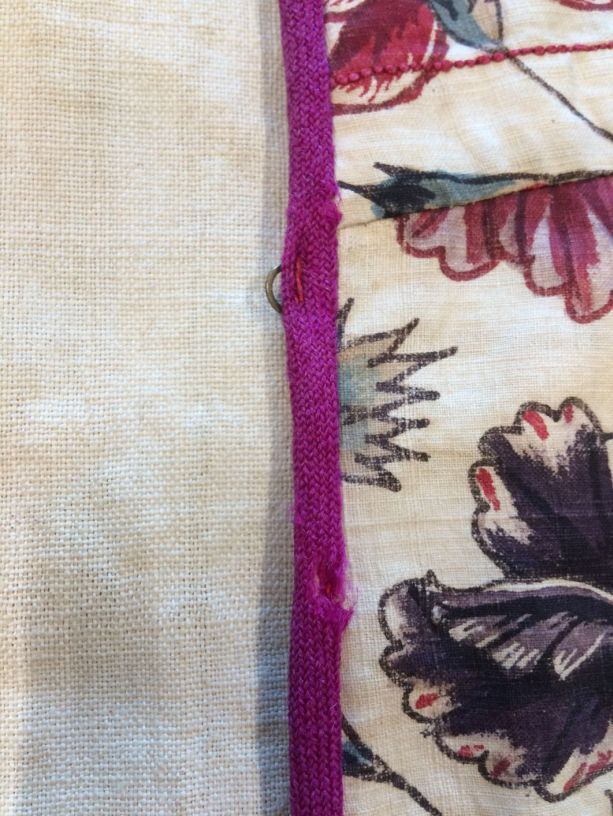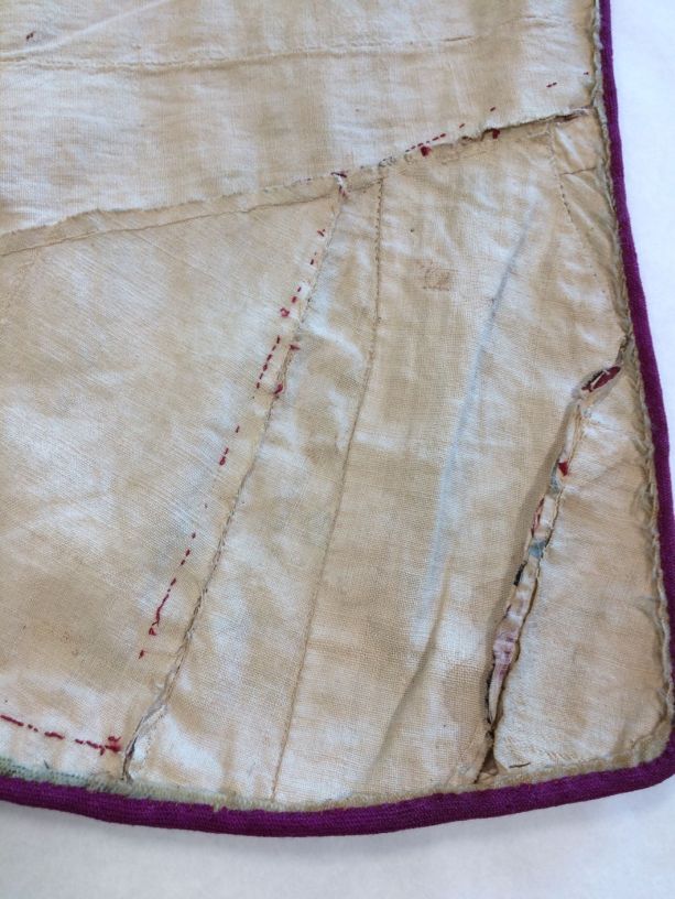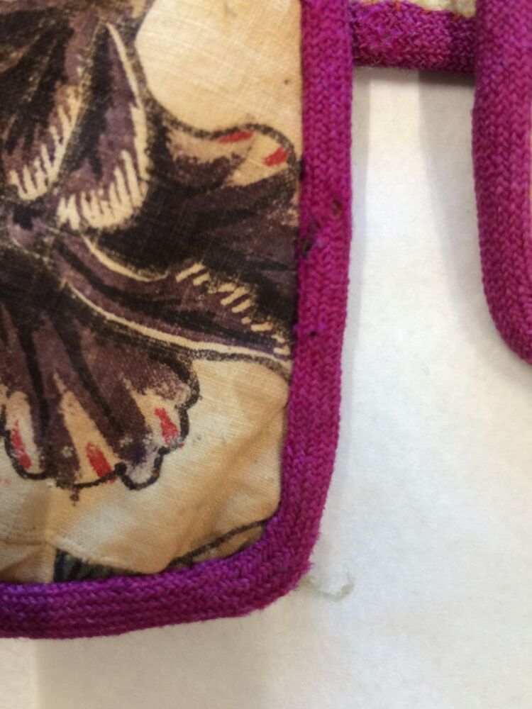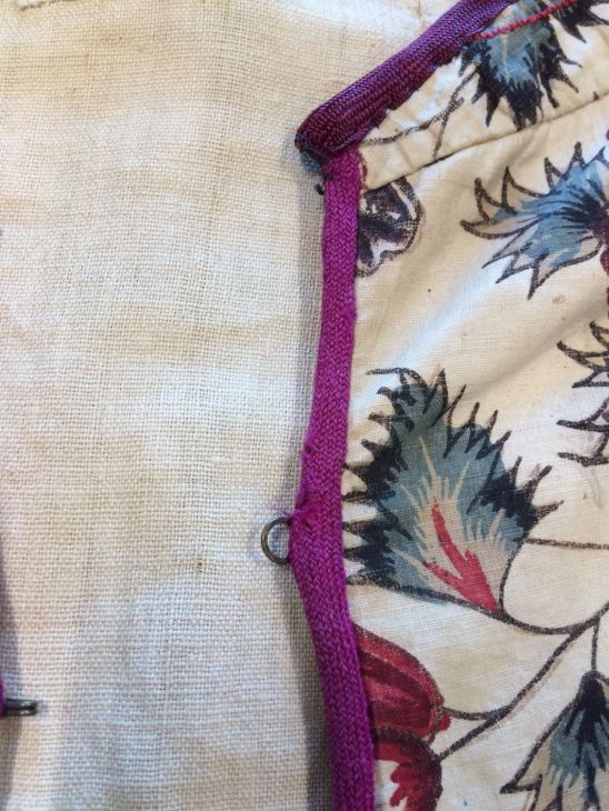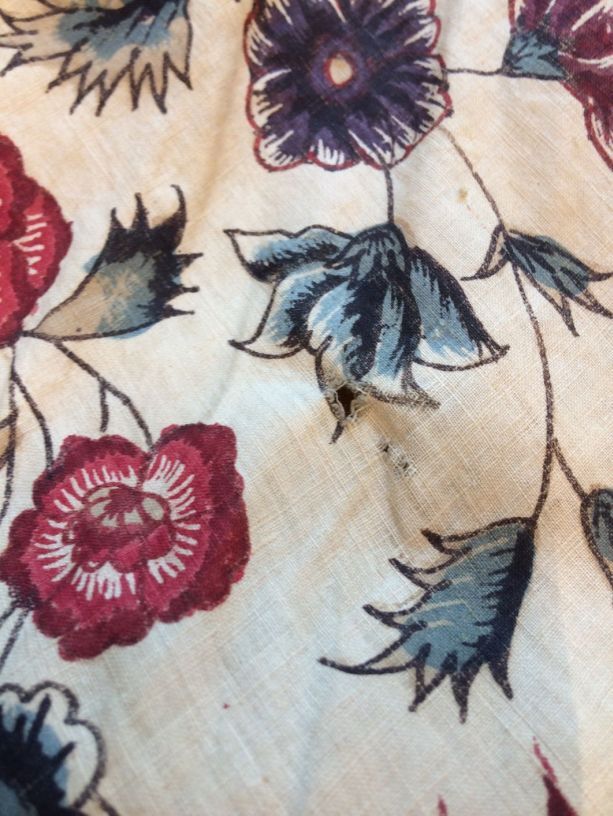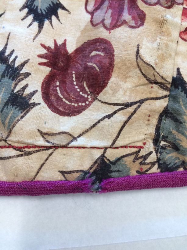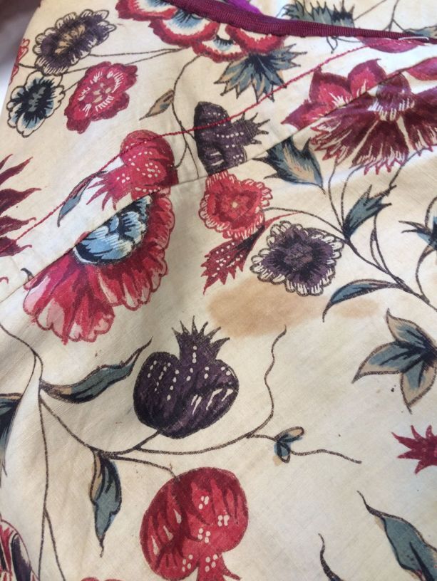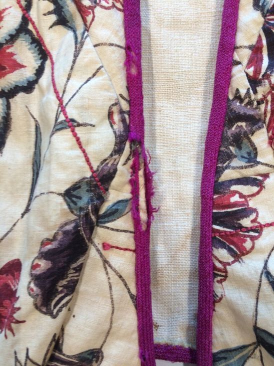 Sitsen Hindeloper skooldermantel gemaakt van wentke met motieven op witte grond waarvan contour, zwart en rood