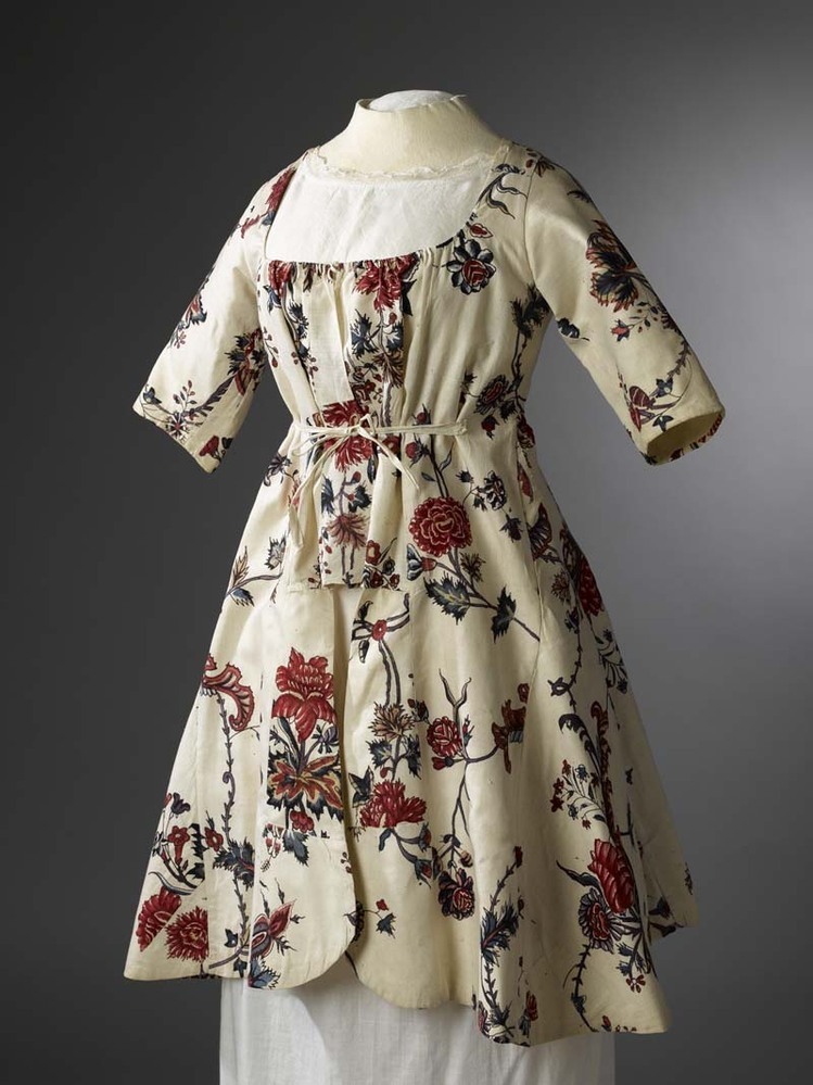 Sitsen vrouwenjak, met verhoogde taille en korte mouwen, met grove bloemranken op witte grond