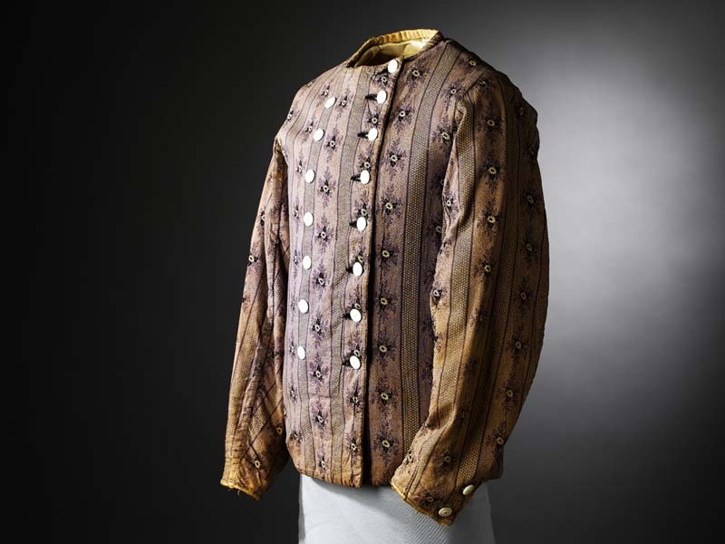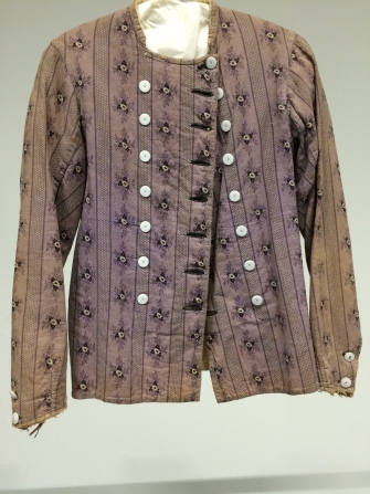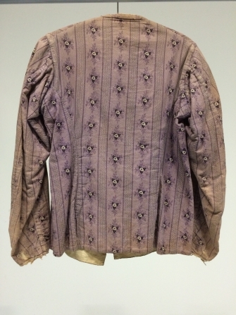 Baeitje of mannenvest met donkerlila strepen met kleine witte rondjes en tussen de strepen een witte bloem