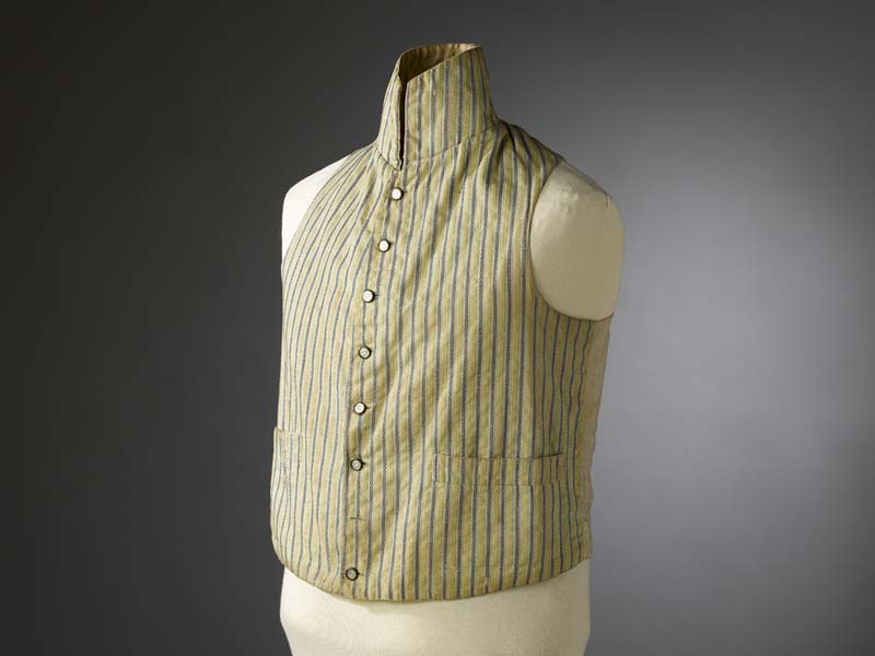 Mouwloos empire vest van gestreepte stof, geel en lichtblauw, hoge staande kraag, paarlemoeren knoopjes