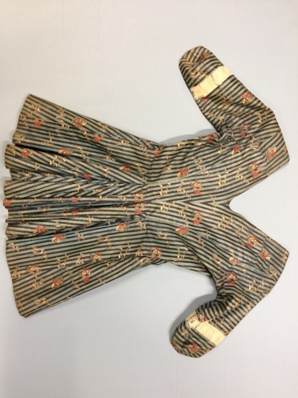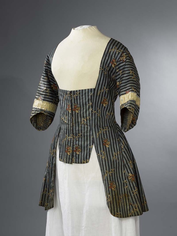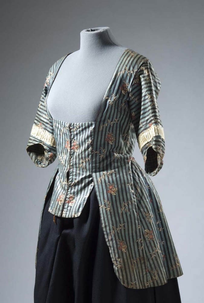 Hoogglanzend sitsen vrouwenjak, met geplooide schoot en ingezette vestpandjes, bedrukt met blauwe en zwarte strepen waarover een strooimotief van bloemen