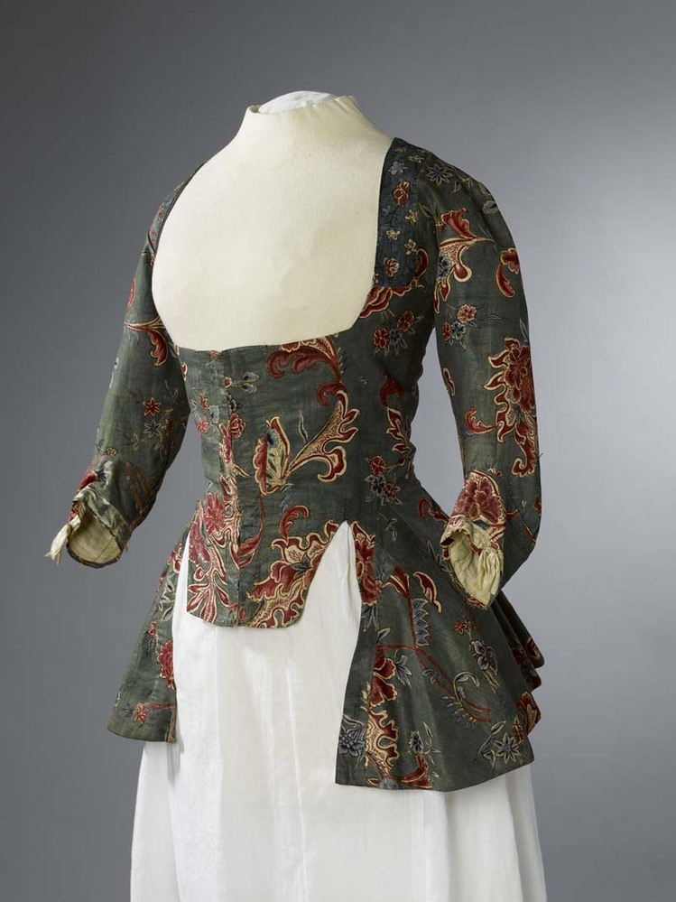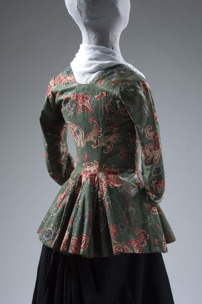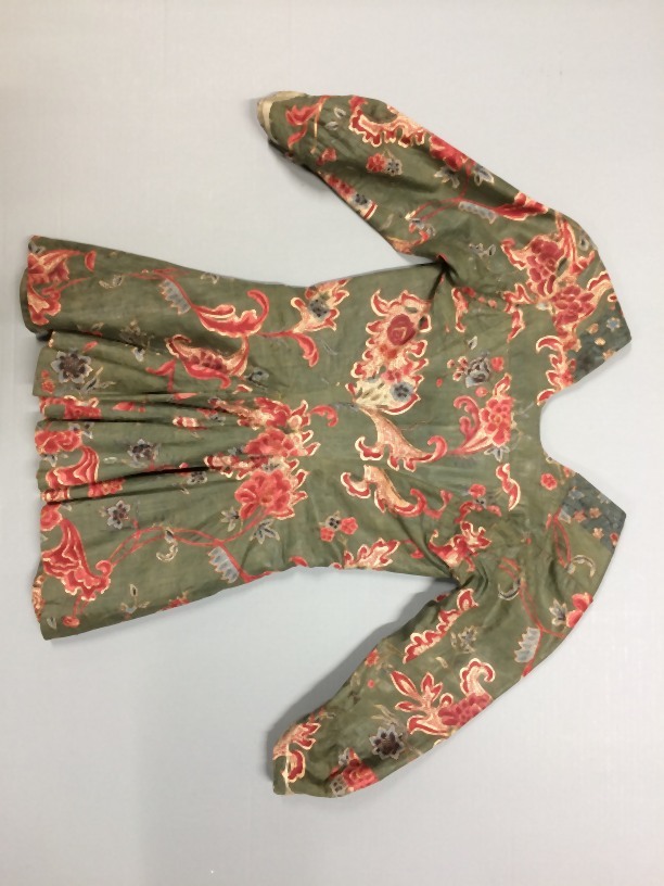 Sitsen vrouwenjak, met ingezette vestpanden, geplooide schoot beschilderd met a-symmetrische bizarre bladeren en fantasiebloemen op groene grond