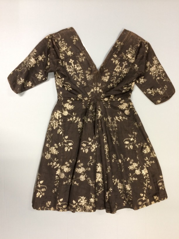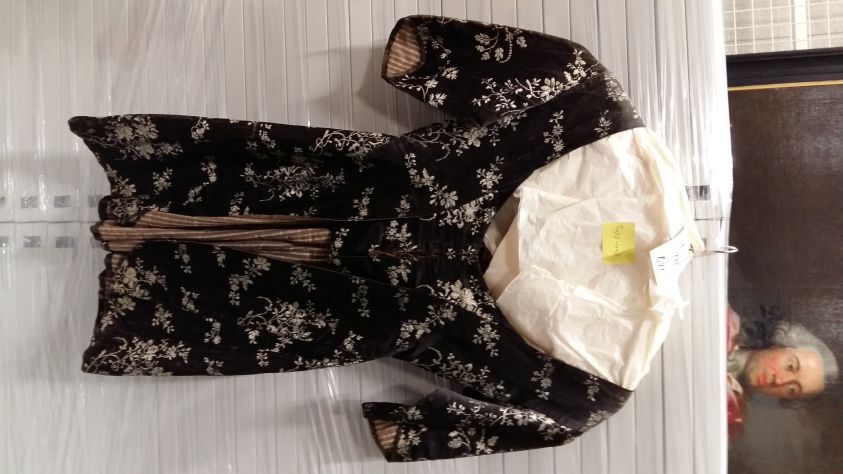 Jak van zwart zijde-linnen met ingeweven blauw wit bloempatroon, gevoerd met gestreept bruin beige linnen