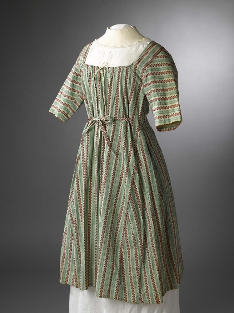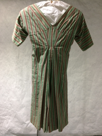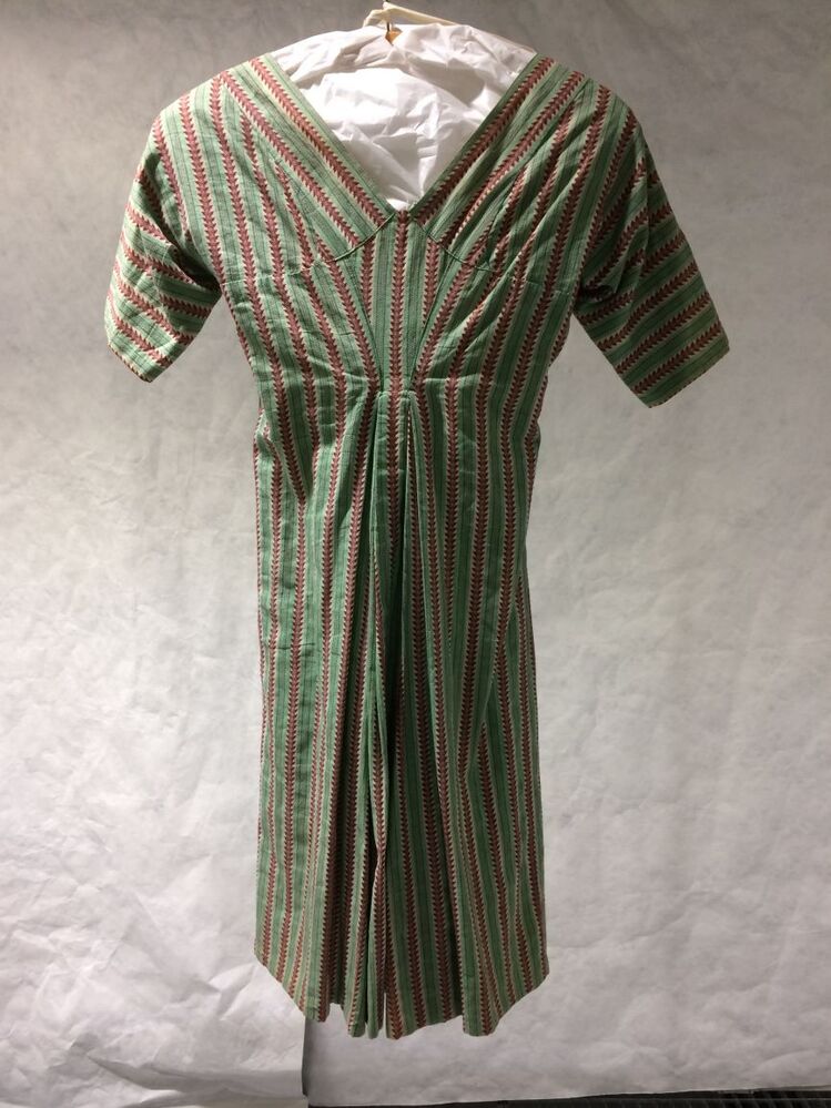 Empire-jak met lange schoot en korte mouwen van bedrukt katoen met groene en witte strepen en strakke donkerrode florale banen