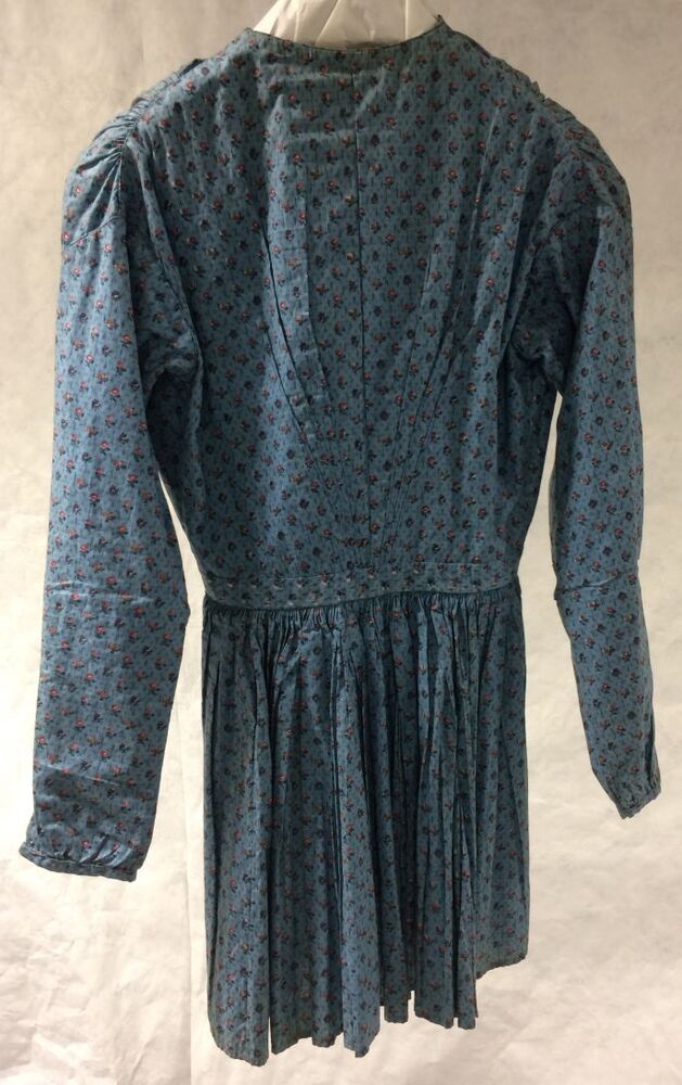 Schootjak van blauw katoen bedrukt met diverse strooimotiefjes: stippen, streepjes, roze roosjes met lange mouwen