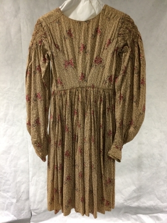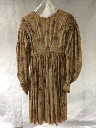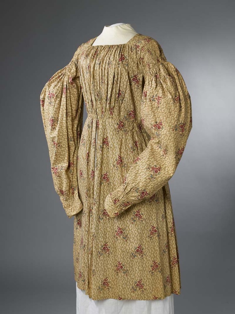 Jak van bedrukt katoen met beige gewolkte grond met strooimotief van toefjes rozen, met schapeboutmouw en lange schoot