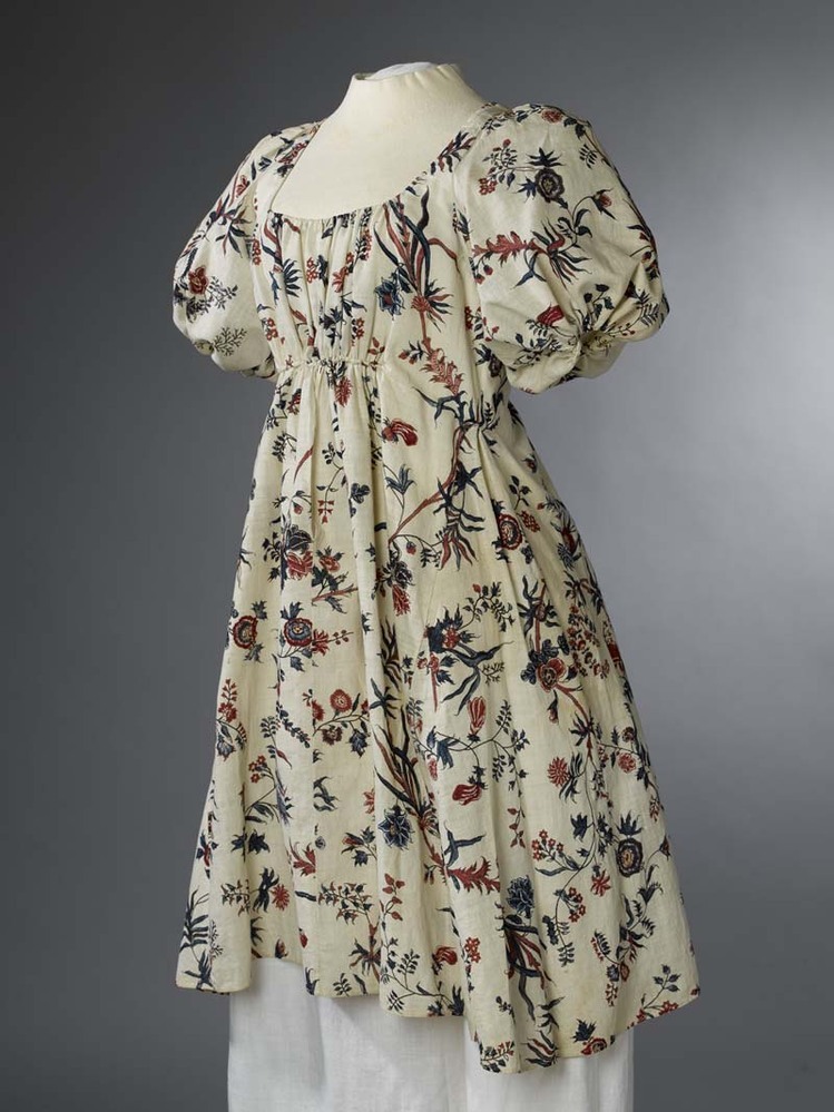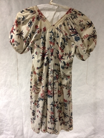 Sitsen Empire vrouwenjak, met pofmouwen, beschillderd met golvende bloemtakken met spitse bladeren op witte grond