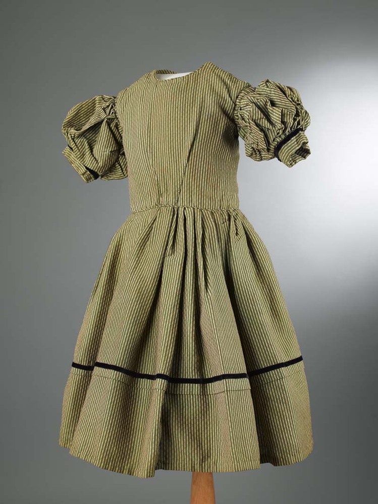 Jurkje van groen-crème gestreepte wollen stof met pofmouwen