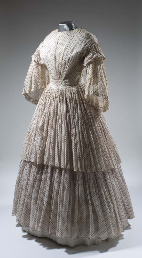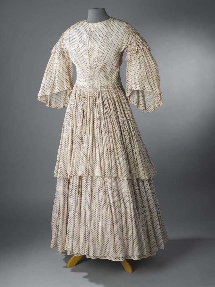 Crinolinejapon van mousselineachtige stof, bedrukt met kleine motiefjes in rood en blauw, wijde pagodemouwen en zeer ruime gerimpelde rok met stroken