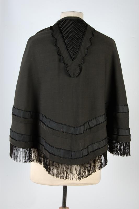Korte cape van zwarte wol afgezet met randen ribszijde en satijn
