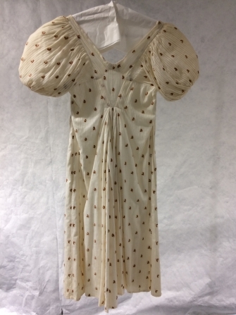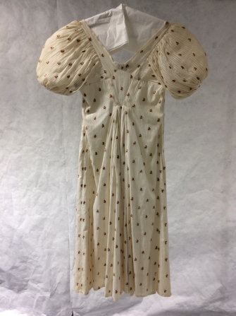 Empire jak met lange schoot en pofmouwen van transparant gestreept katoen met getamboereerde bloemknopjes van geel-bruine wol