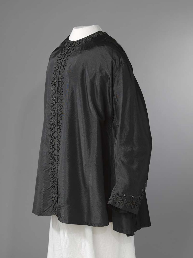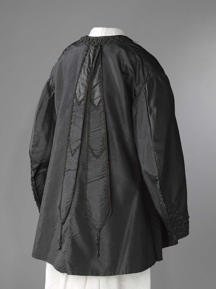 Klokkend crinolinejak van zwarte taftzijde afgezet met passement met kraaltjes, op de rug twee slippen