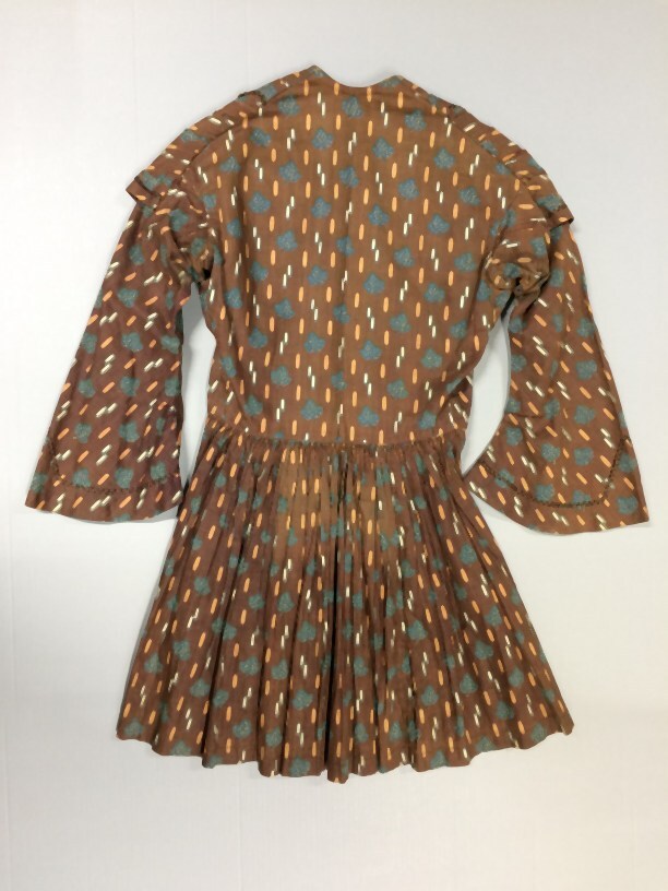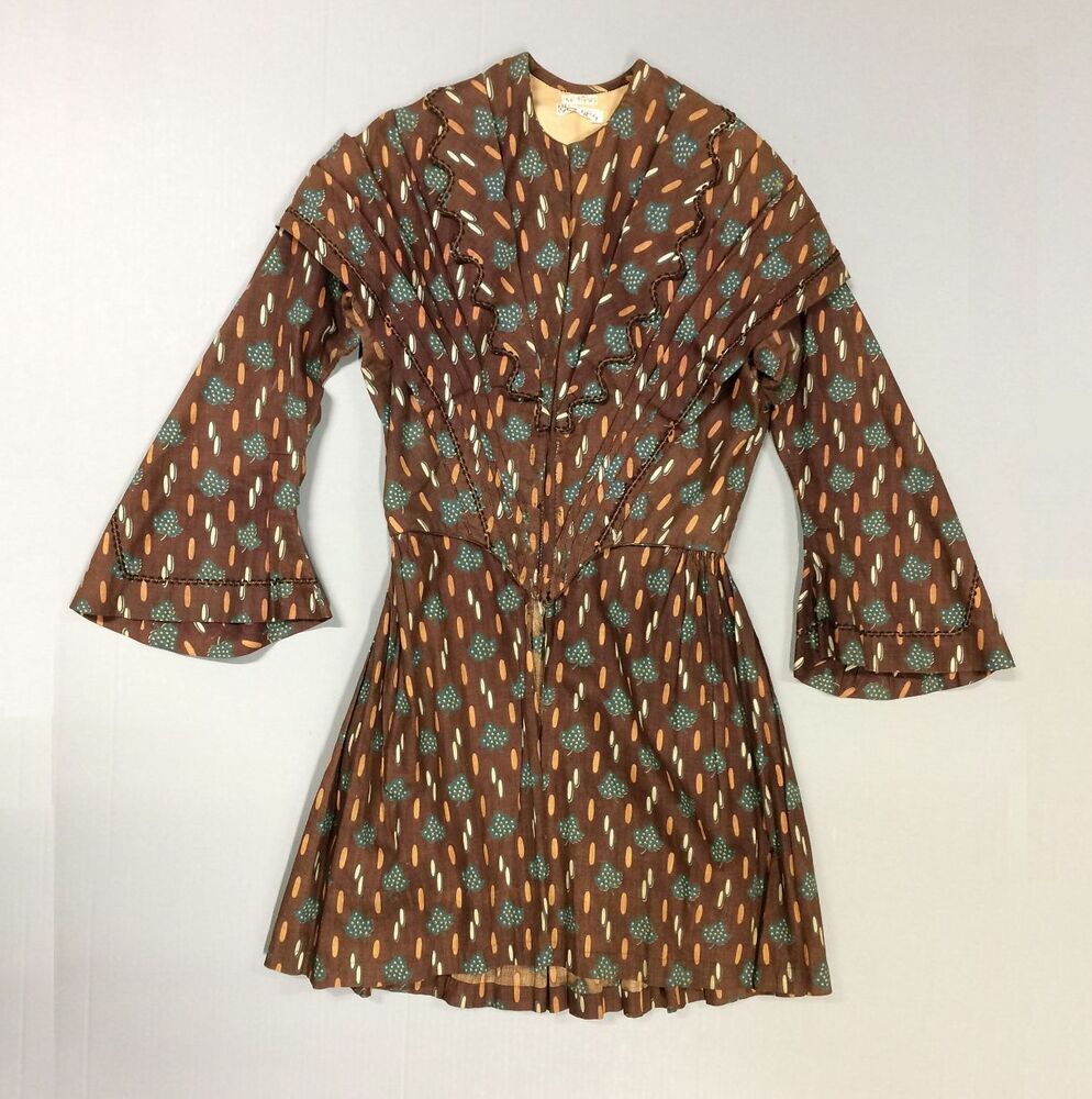 Schootjak van bedrukt katoen, o.a bruin met groene bladvormen met slanke pagodemouwen