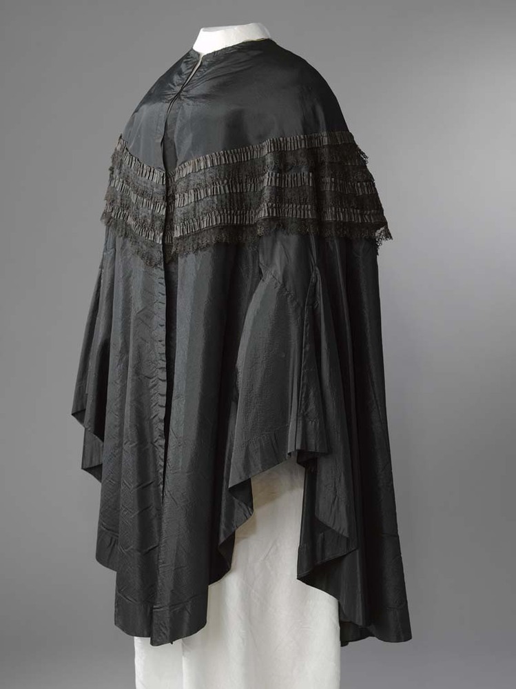 Zeer wijde mantelet van zwarte zijde, om de schouder afgezet met stroken kant en gerimpeld zijden band