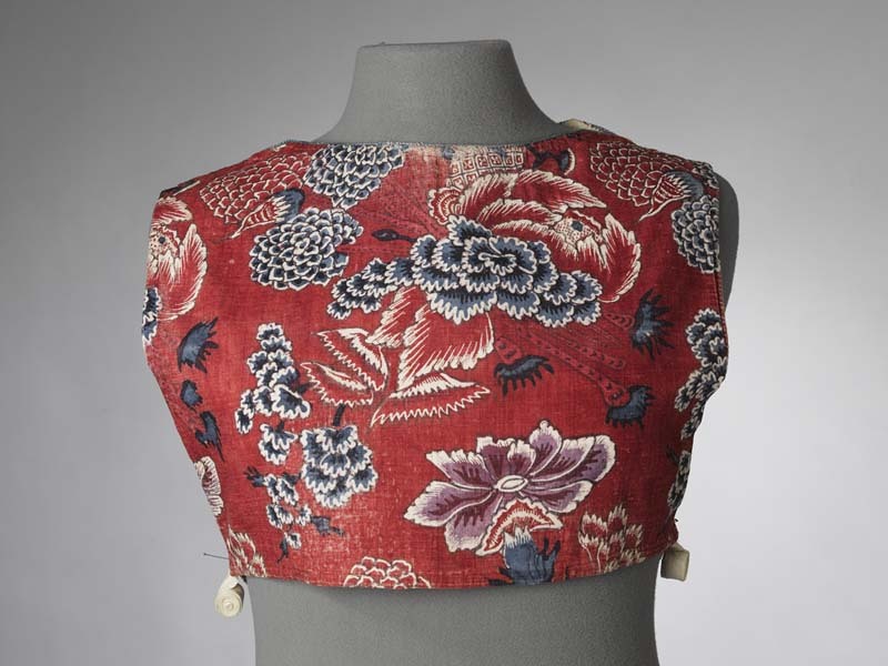 Sitsen vrouwenkroplap ofwel onderst, met losse 'bloemstukken' op rode grond