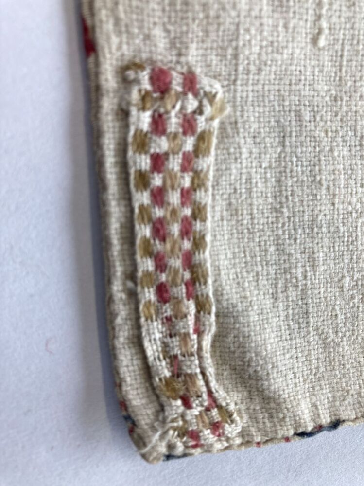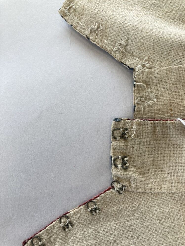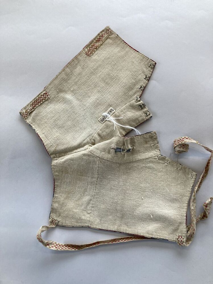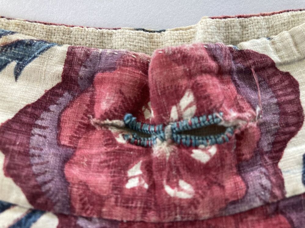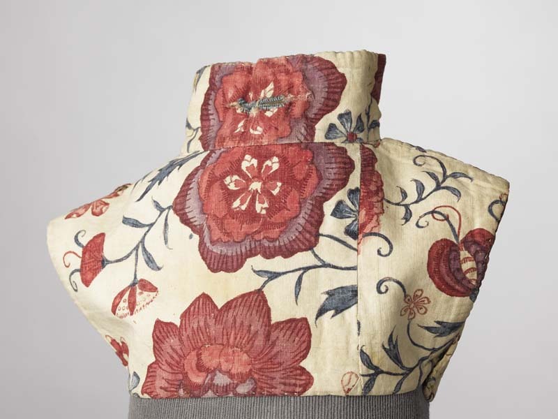 Sitsen jongenskroplap, met boord met knoopsgaten voor keelknopen, groete bloemen aan dunne ranken op witte grond
