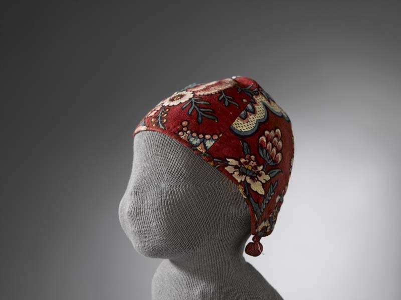 Sitsen jongensmuts, kantpatroon en gestileerde bloemen op rode grond