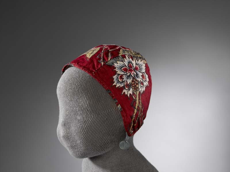 Sitsen meisjesmuts, met dubbele bamboestengels en gestileerde bloemen op rode grond
