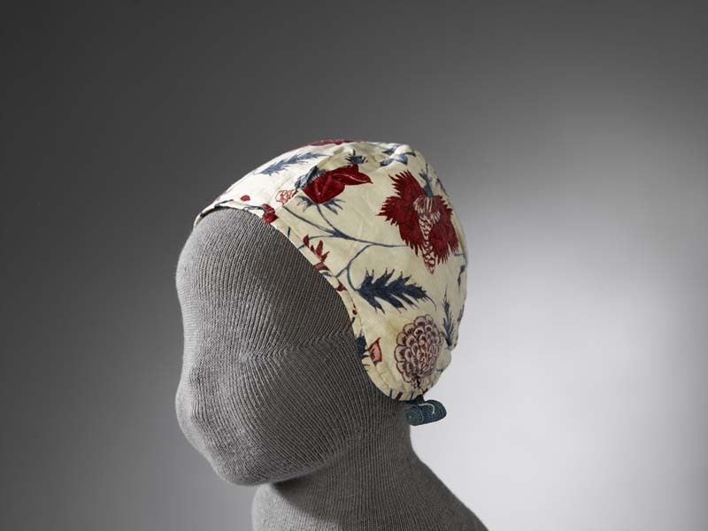 Sitsen meisjesmuts, met dunne bloemranken en gedetailleerde bloemen op witte grond