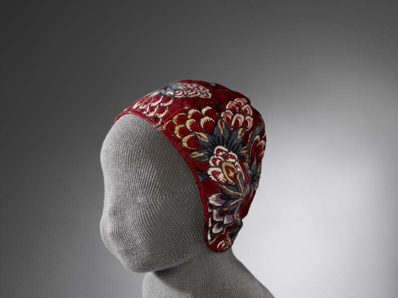 Sitsen meisjesmuts, met toefen hopbloemen op rode grond
