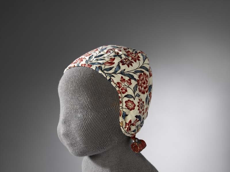 Meisjesmuts, bedrukt in sitspatroon met dunne bloemranken op witte grond