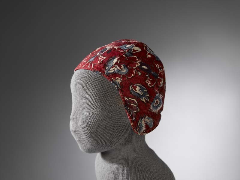 Sitsen jongensmuts, vlot geschilderde bloemen op rode grond,