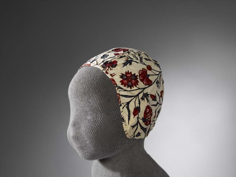 Sitsen meisjesmuts, beschilderd met dunne bloemranken op witte grond