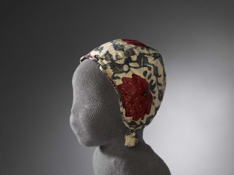 Sitsen meisjesmuts, bedrukt en geschilderd met bloemrank met rozetvormge bloemen op witte grond