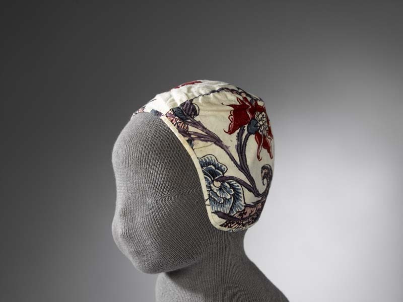 Sitsen meisjesmuts, met diverse bloemen aan paarse stengels op witte grond