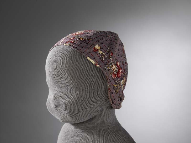 Meisjesmuts, bedrukt met fantasiebleoem op op paarse grond met dunne onderbroken strepen