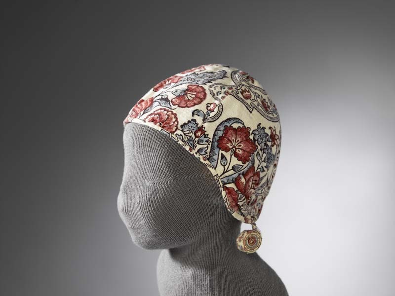 Bedrukt katoenen jongensmuts, barokke banden met bloemen op witte grond