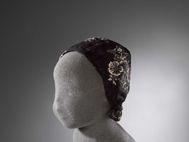 Meisjesmuts, bedrukt met paarse boeketjes op zwarte grond