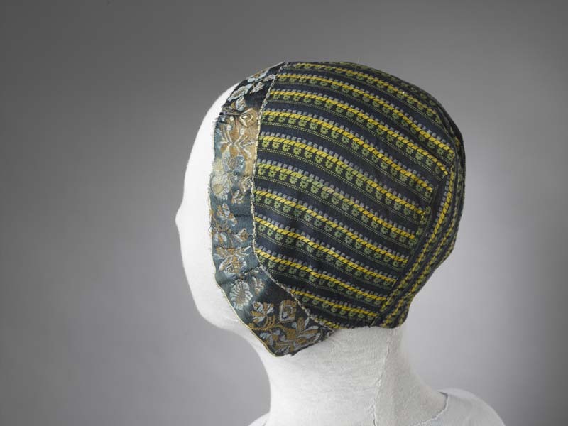 Muts van katoen, smalle strepen van blauw, wit, geel met groene bloempjes, zwart, langs de voorzijde blauw zijden band met ingeweven motieven