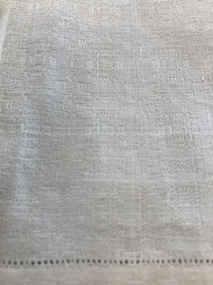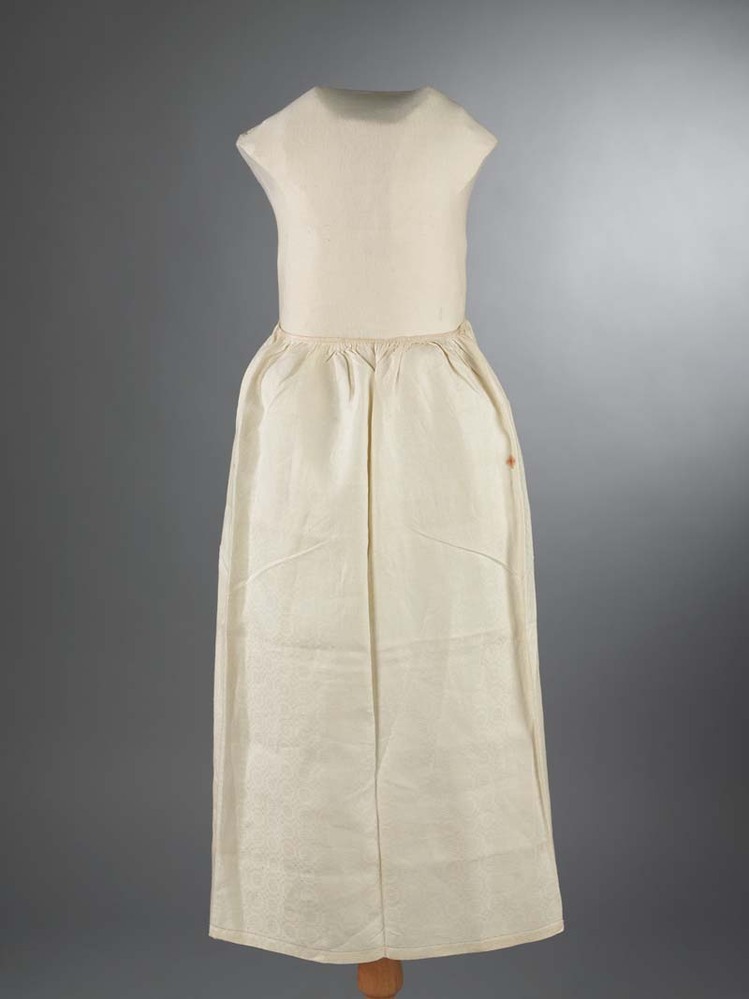 Een kinderschortje van fijn damast, smal opengewerkt randjelangs zoom, gemerkt met initialen ID