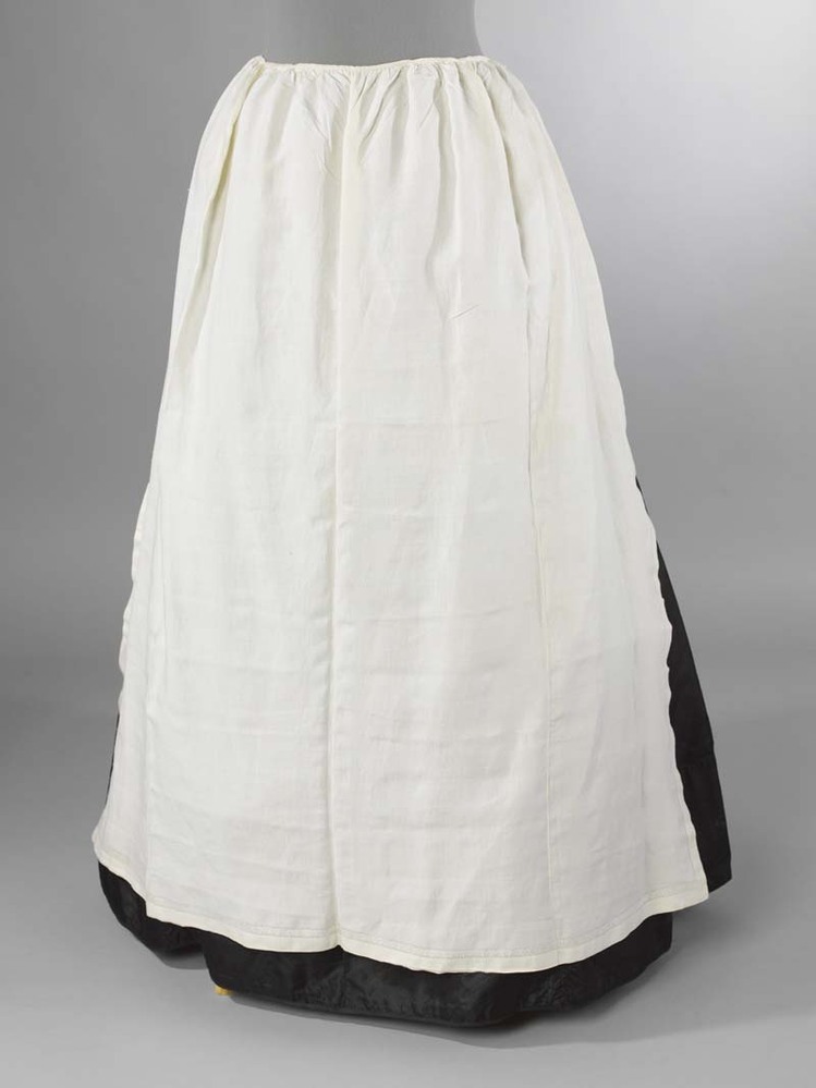 Een schort van fijn linnen, smal opengewerkt randje met aan de onderkant een rand met samengetrokken draden