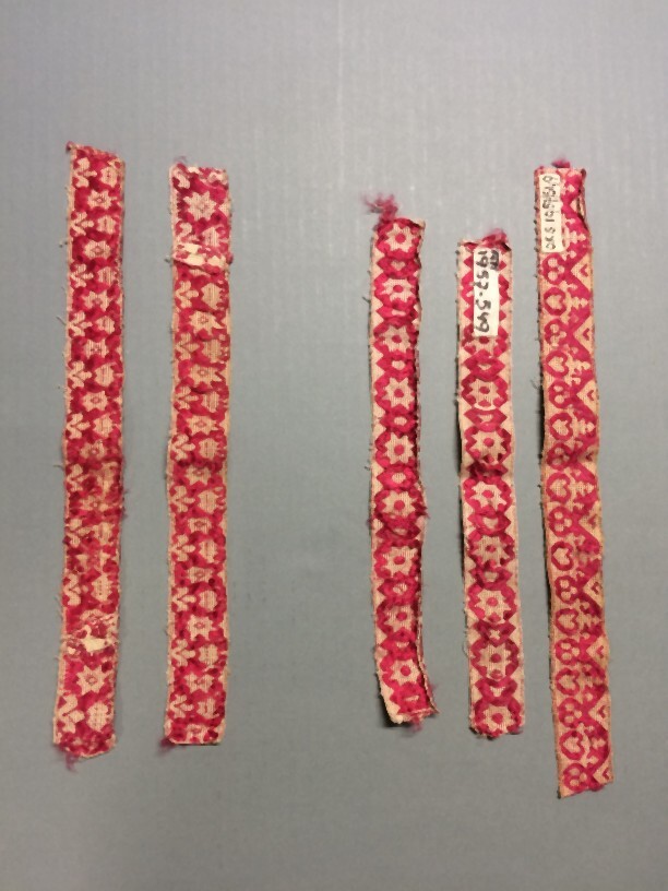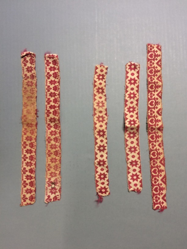 Twee verschillende witte strookjes langet, met rood bewerkt