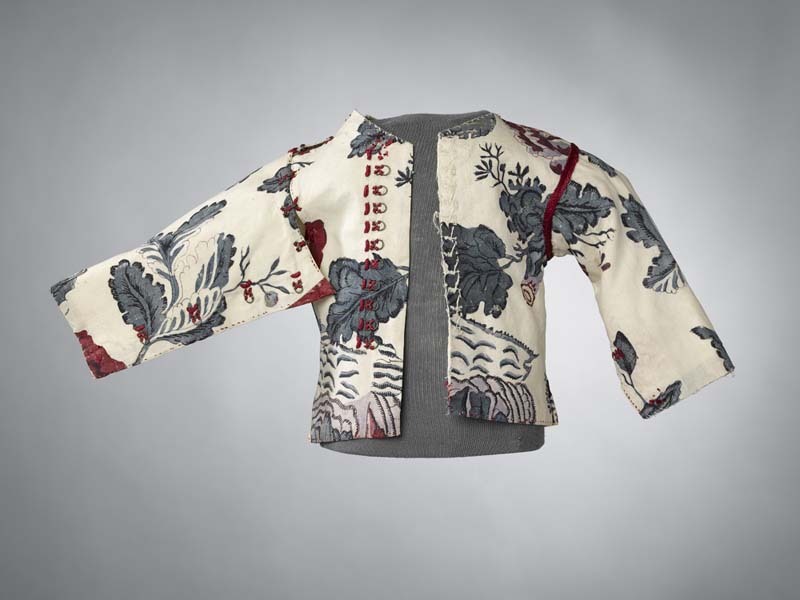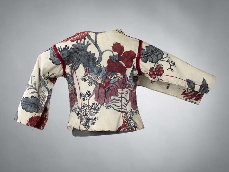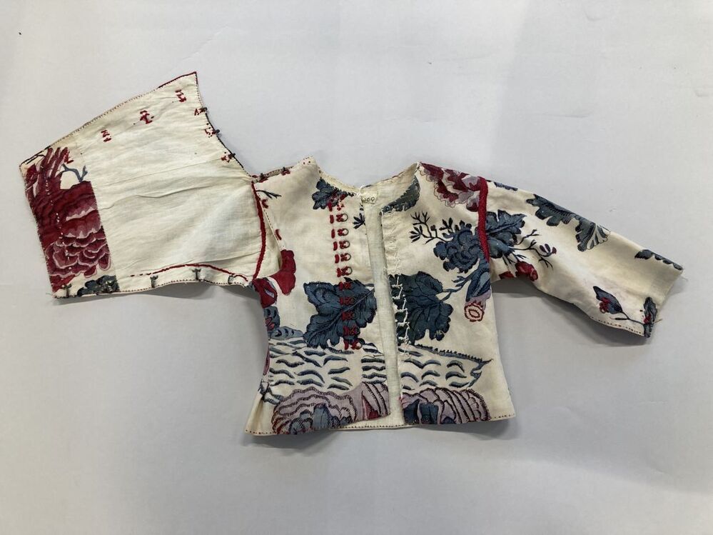 Sitsen babyjakje uit Hindeloopen, 'sliepwentke', met fragment van groot motief met landschap op witte grond