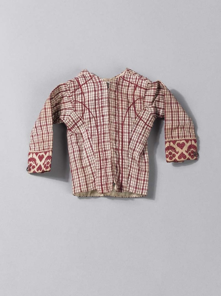 Een poppenjakje van Hindelooper bont, langs de onderkant van de mouwen rood langet, gevoerd met linnen en katoen