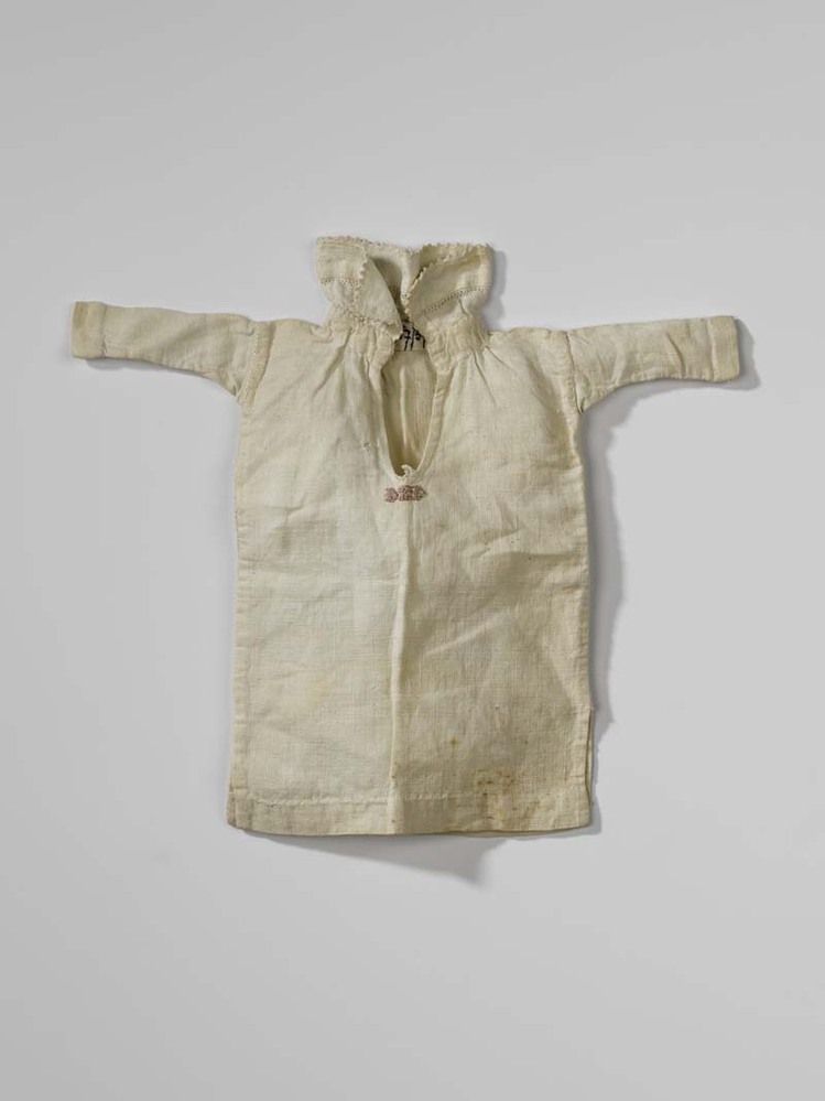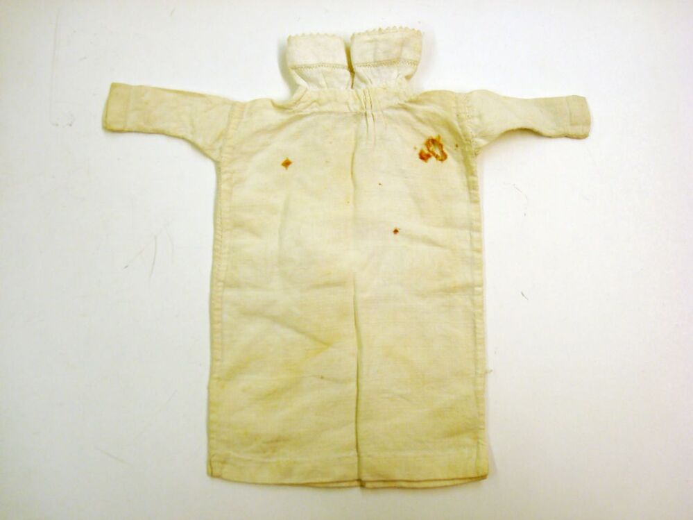 Poppenhemdje van linnen, van voren een splitje met spinnetje, kraagje met open randje, twee splitjes opzij, initialen D+D