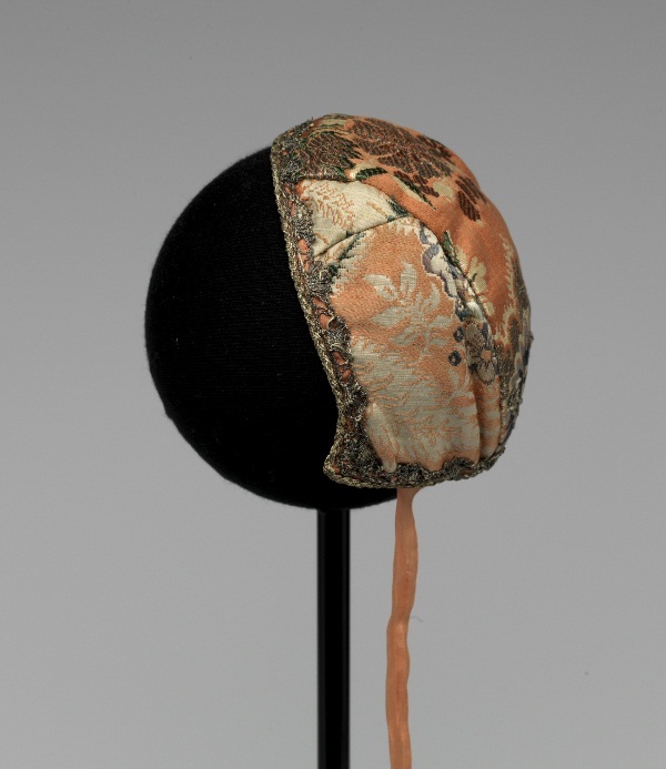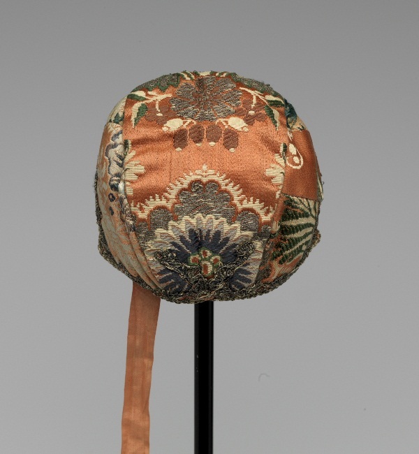 Mutsje van damast, driebaans, in roze, lichtblauw, bruin, groen, met zilverdraad bewerkt, langs de rand koordje van gouddraad